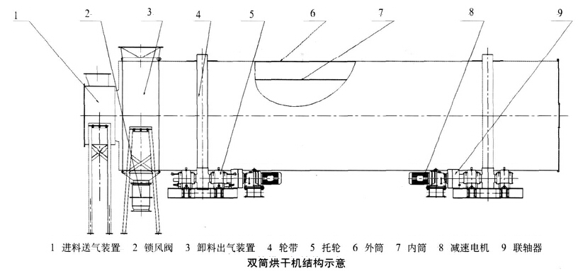 雙筒烘干機(jī)是一種直接傳熱式的回轉(zhuǎn)式烘干機(jī),主要是由內(nèi)筒體、外筒體、托輪、輪帶支承裝置、傳動(dòng)裝置、進(jìn)料進(jìn)氣、卸料出氣密封裝置等組成。